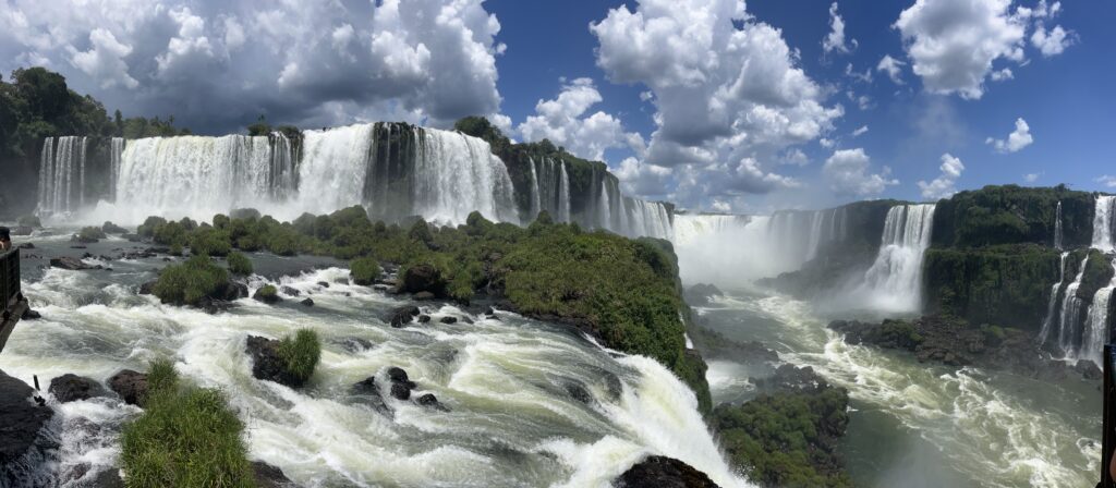 Le nom Iguazú vient du guarani: « y » pour eau et « guasu » pour grand. Ne cherchons pas, le nom en guarani dépeint très bien ce site patrimonial mondial reconnu par l’Unesco depuis 1984. L’ensemble est constitué de 275 cascades réparties sur une longueur de plus de 3 kilomètres. Les chutes ont certainement servi de déterminant géographique car elles se situent au confluent de trois pays: Paraguay, Argentine et Brésil. Les chutes se retrouvent principalement en territoire argentin mais la vue du territoire brésilien sur l’ensemble est magnifique. Chacun des pays en ont fait un parc national; à juste titre. L’ensemble des chutes peut déverser jusqu’à 6 millions de litres d’eau par seconde. C’est vous montrer l’ampleur de ces chutes.